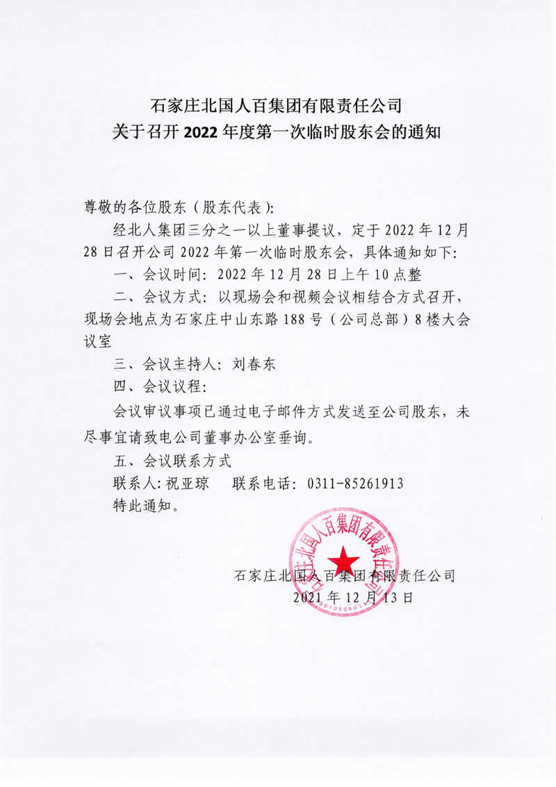 石家莊北國人百集團有限責(zé)任公司關(guān)于召開2022年度第一次臨時股東會的通知