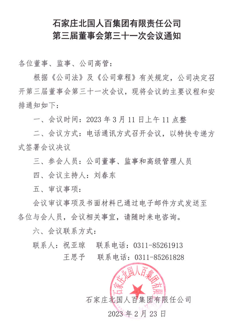 石家莊北國(guó)人百集團(tuán)有限責(zé)任公司第三屆董事會(huì)第三十一次會(huì)議通知