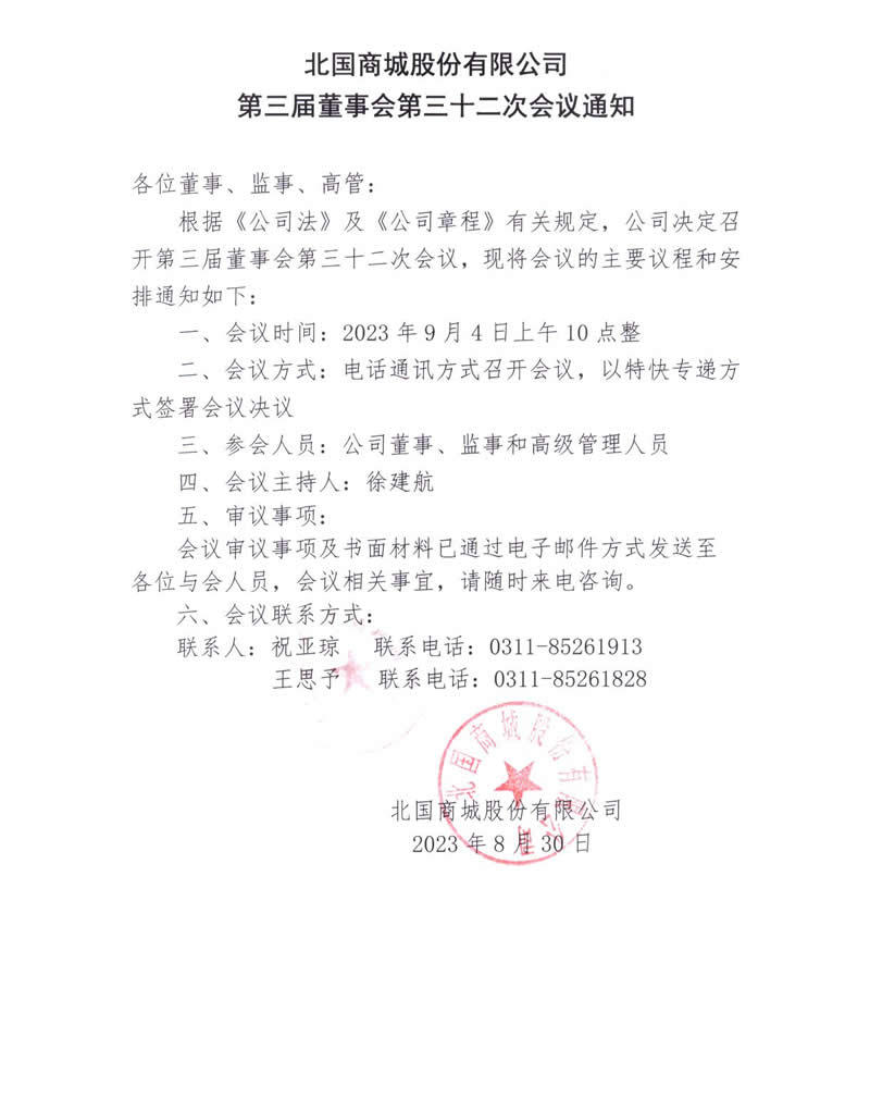 北國商城股份有限公司第三屆董事會(huì)第三十二次會(huì)議通知