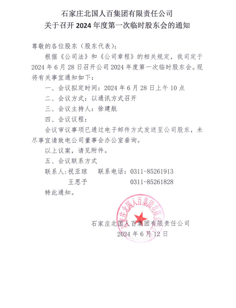 石家莊北國(guó)人百集團(tuán)有限責(zé)任公司關(guān)于召開(kāi)2024年度第一次臨時(shí)股東會(huì)的通知