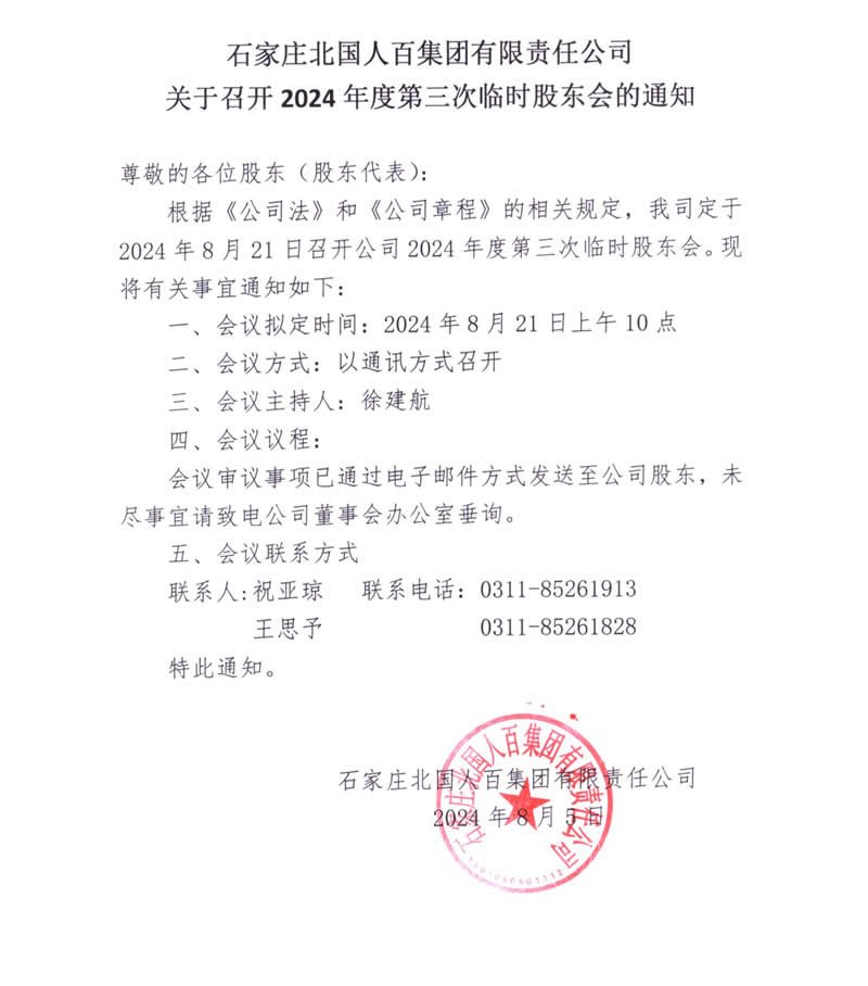 石家莊北國人百集團(tuán)有限責(zé)任公司關(guān)于召開2024年度第三次臨時(shí)股東會(huì)的通知