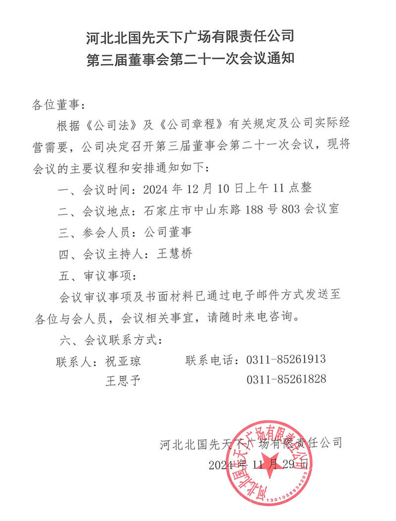 河北北國先天下廣場有限責(zé)任公司第三屆董事會第二十一次會議通知