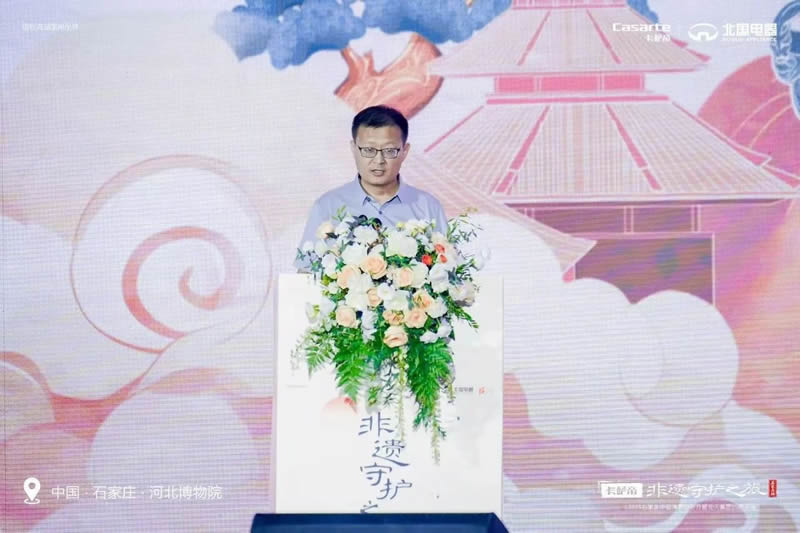 北人集團黨委書記、董事長徐建航致辭,他代表北人集團向出席活動的領導來賓表示熱烈歡迎,向精心籌備活動的卡薩帝品牌、國寶守護者們致以崇高的敬意。他表示,非遺是一個地域最鮮活的歷史記憶,守護非遺就是守護我們的文化根脈。今天以“非遺守護之旅”為主題,在河北博物院舉辦本次活動,正是基于對這份文化瑰寶的高度珍視與傳承使命的深刻認同。今年是北人集團成立25周年,集團攜手卡薩帝啟動非遺守護之旅,與消費促進月完美結(jié)合,旨在以創(chuàng)新的理念、時尚的表達、多元的渠道,推動非遺技藝與現(xiàn)代設計、高端制造、品質(zhì)生活深度融合,實現(xiàn)文化價值與經(jīng)濟價值的雙提升,真正讓市民在消費體驗中感受文化魅力,在文化浸潤中提升生活品質(zhì)。祝愿卡薩帝非遺守護之旅取得圓滿成功,祝愿石家莊消費促進月活動精彩紛呈,也祝愿大家在今天的文化藝術(shù)盛宴中,度過一段美好而難忘的時光。